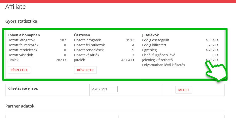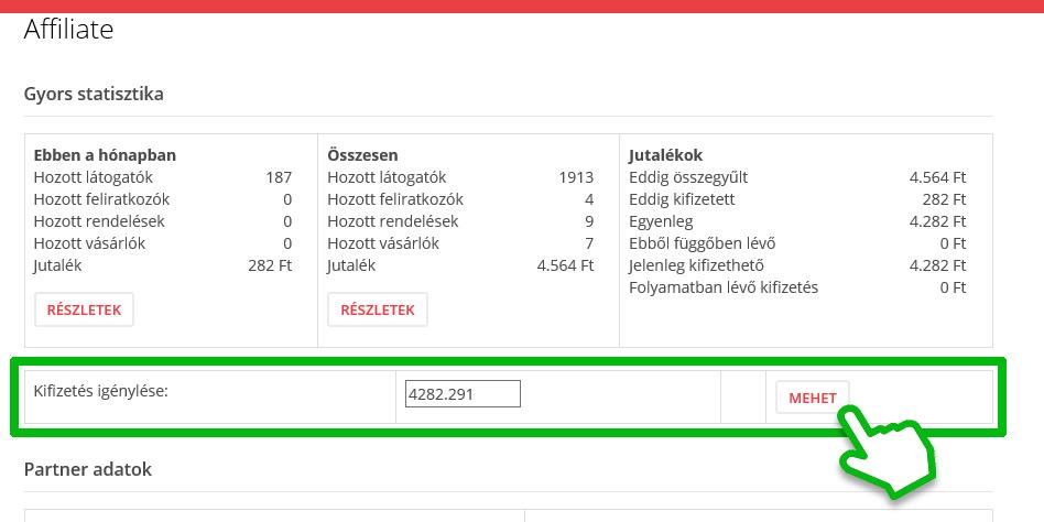 - Jutalék igénylése: A kifizetés igénylése mezőben látható összeget bármikor lekérheted a Mehet gombra kattintva. A levásárolható kuponodat e-mailben küldjük ki ezután.