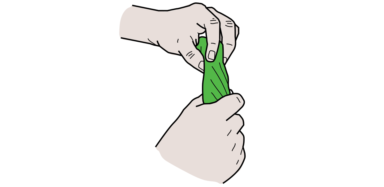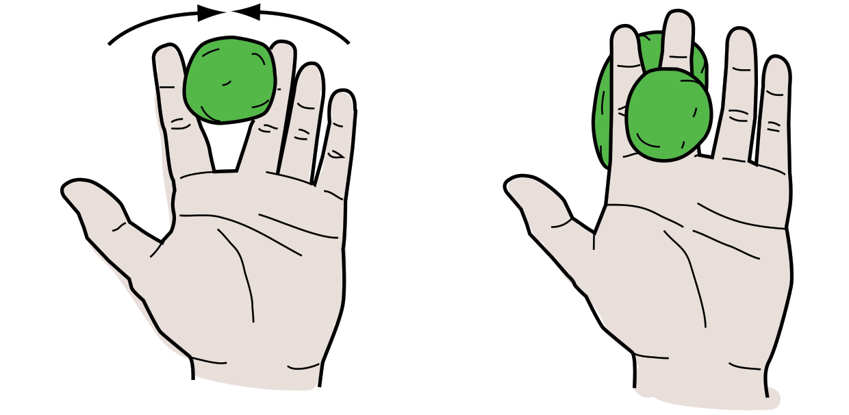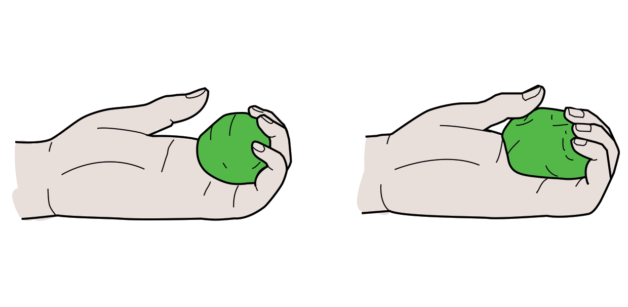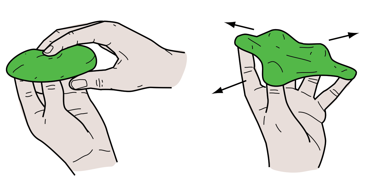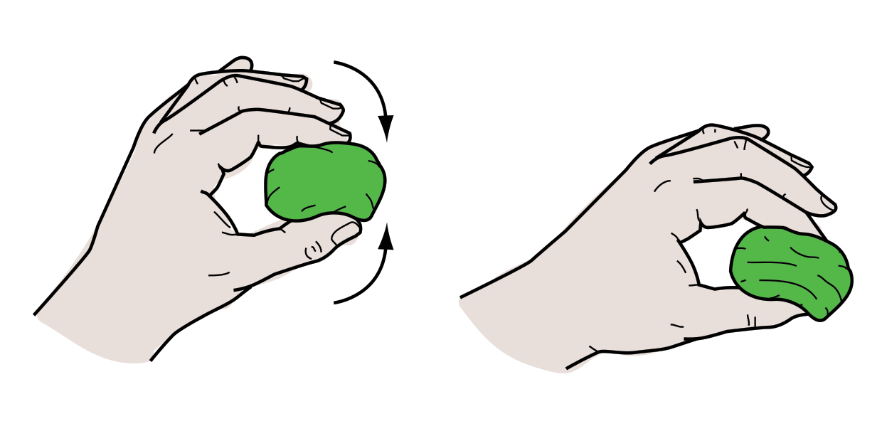 Vedd a gyurmát egyik kezedbe, majd próbáld ökölbe szorítani úgy, hogy a gyurmát összepréseled a tenyérrel és az ujjakkal. Engedd fel, szorítsd meg újra. Ha sokszor ismétled a gyakorlatot érdemes az elvékonyodott gyurmahengerből időről időre újra gombócot formálni.