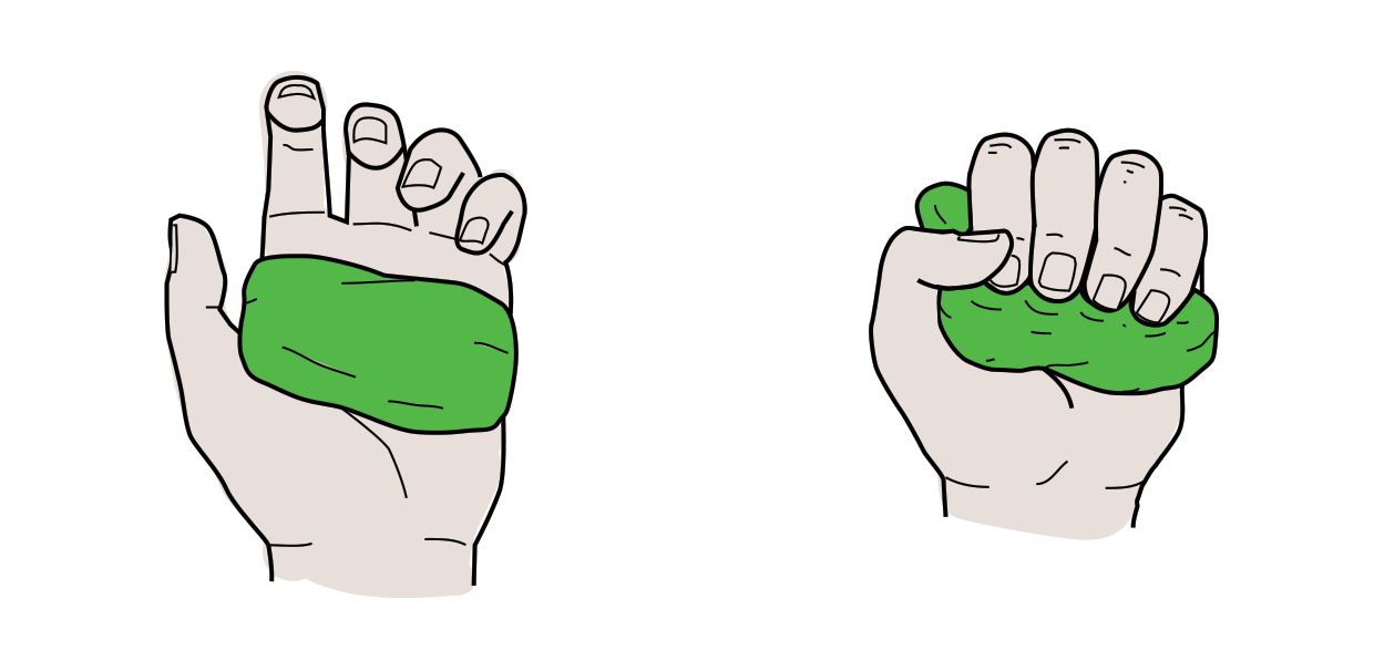 Képezz egy vastagabb korongot a gyurmából az erősítendő kézfejed ujjait belenyomva a másik kezeddel rásimítva azt. Nyisd szét az ujjaid a gyurma ellenállása ellenében, majd zárd össze és nyisd ki újra.